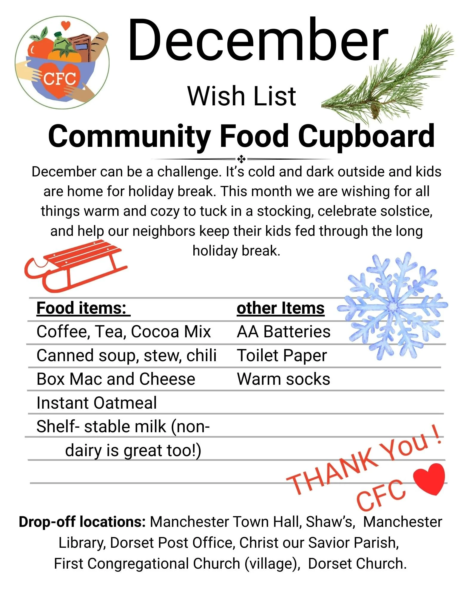 If it’s snowing outside CFC may be closed. We follow the lead of Manchester Elementary/Middle School. If they close due to weather, so will we. You can check https://app.vpr.org/school-closings/ for updated information.